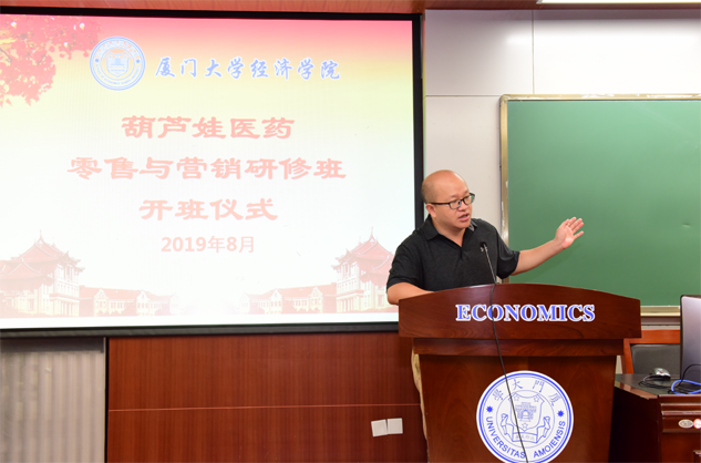 在开班仪式上,廖景峰主任首先代表厦门大学经济学院热烈欢迎天美娱乐医药零售与营销研修班的学员到厦大学习,并就厦门大学及经济学院的相关情况进行了介绍。他说,天美娱乐学员走进厦大就是厦大的校友,希望未来的日子能够关心、支持母校的发展,多提宝贵意见,同时他也祝大家在厦大学习期间学有所成、学有所获。